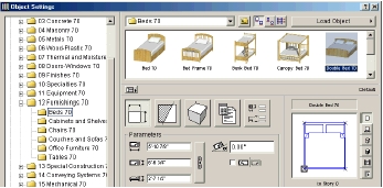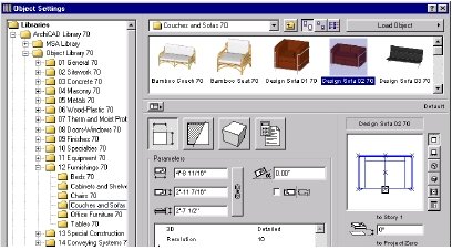 Объекты библиотеки ArchiCAD охватываю большой спектр элементов от мебели и инвентарь ванной до любого стандартного блока, который Вы можете захотеть определить, к примеру балюстрад, специальных дымоходы, и т.д.