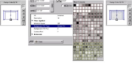 · Установка фоновой заштриховки для символов фурнитуры на плане: Объекты могут отображатся в графической заштриховке в окне поэтажного плана. Кликнем на строке Plan Symbol в окне параметров, чтобы отобразить параметры плана. Если вы желаете выбрать другую штриховку, подсветите Background Fill Pen и выберите цвет. После этого выберите Background Fill Type и кликните на отобразившемся символе чтобы просмотреть возможные штриховки.