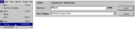 · Создание чертежа PlotMaker для нижнего этажа: прежде всего убедимся что все чертежные элементы и уровни, которые должны быть видимыми в напечатаном документе соответственно отображаются на экране. Перейдем в меню File и выберем Save As. Изменим формат файла на чертеж PlotMaker. Сохраним чертеж PlotMaker под именем 'Plan-0' соответствующий каталог проекта.