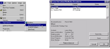 1. Связаные чертежи: Когда выбираете Save Special/Hotlinked Drawings, ArchiCAD приготавливает и отображает список файлов, сохраненных в формате PlotMaker из поэтажного плана или окна Сечения/Перспективы текущего проекта, которые содержат имена и расположения файлов, а так же как имена комбинаций уровней, которые были активны в момент сохранения.