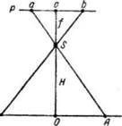При плановой аэрофотосъемке стремятся к тому, чтобы главная оптическая ось была отвесна, т. е. чтобы угол d = 0. В этом случае плоскость аэронегатива Р параллельна горизонтальной плоскости Е. Сечение этих плоскостей вертикальной плоскостью в любом направлении дает взаимно параллельные следы, которые мы также обозначим через РиЕ (рис. 3.4) Так как Оо перпендикулярна Р, то из подобных треугольников aSb и ASB следует, что