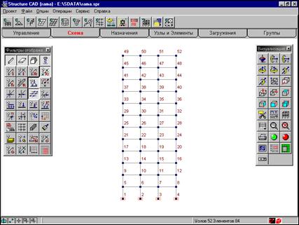 После того, как схема создана, можно воспользоваться фильтрами управления отображением (см. рис. 1.1) и получить информацию о номерах узлов и элементов, типах жесткости и типах элементов. Для этого следует активизировать соответствующие кнопки на панели фильтров, показанные ниже.