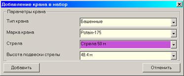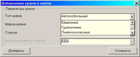 Для работы с краном его необходимо выбрать из базы данных и добавить в набор используемых кранов. Этот набор сохраняется в чертеже и может быть использован в последующих сеансах работы.
