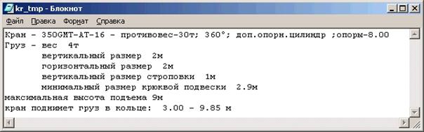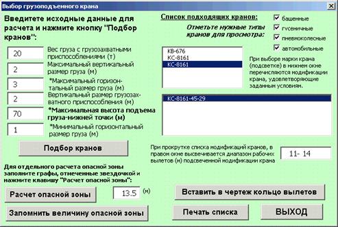 Кран можно выбрать по параметрам груза и высоте его подъема, задав данные в левой части формы. При этом автоматически рассчитывается опасная зона. Для каждого подходящего крана определен диапазон вылетов. Список кранов можно распечатать в MSWord формате