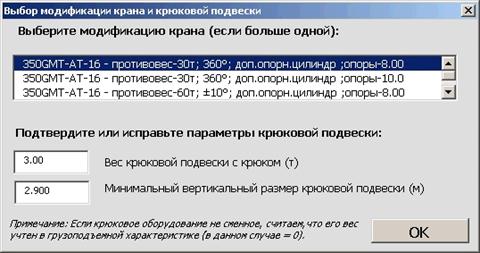 У крана с данным стреловым оборудованием могут быть модификации, из которых надо сделать выбор, а также подтвердить или изменить характеристики крюковой подвески.