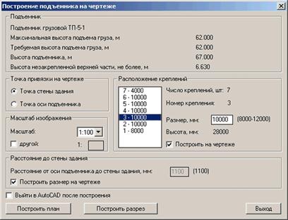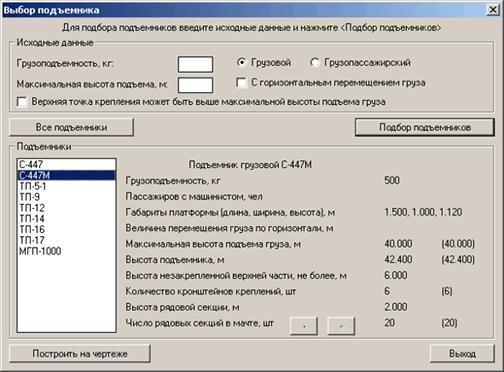 В модуле имеется база данных по мачтовым подъемникам и сервис их подбора и привязки на чертеже в разрезе и плане.