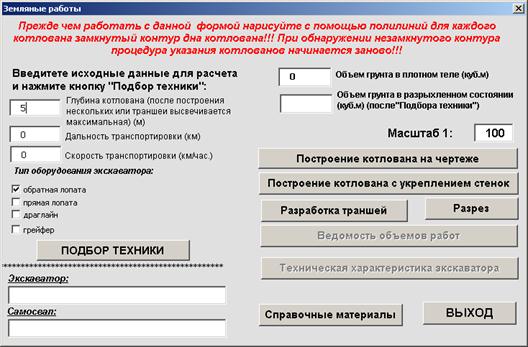 При входе в программу появляется основная форма для ввода исходных данных. Вначале надо указать глубину котлована. Затем провести построение земляного сооружения. Дальнейшие действия зависят от выбора варианта …