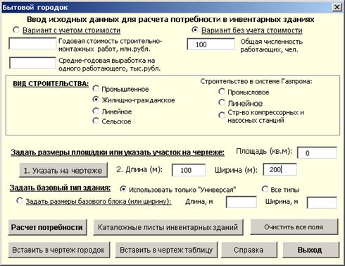 Одним из трех способов указываете размер площадки Бытового городка, затем задаете базовый блок инвентарных зданий и выполняете «Расчет».
