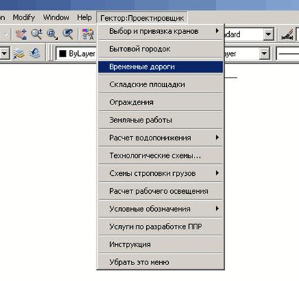 В меню «Гектор: Проектировщик» в AutoCAD находится пункт «Временные дороги».