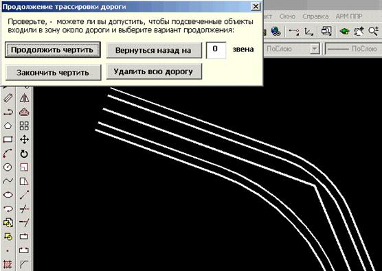 • Демонстрация при вычерчивании зоны отчуждения на каждом отрезке дороги и возможность динамического редактирования последних звеньв.