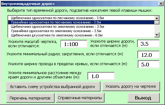 Для выбранного типа дороги можно «Вставить схему устройства…» в виде блока в чертеж.
