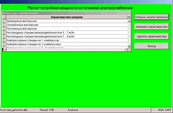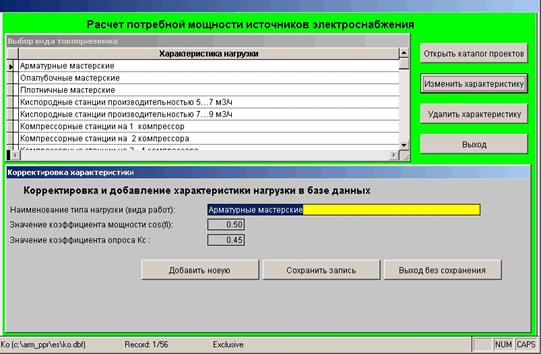 При входе в программу появляется таблица с характеристиками нагрузок, для которых имеются коэффициент мощности cosj и коэффициент спроса Кс
