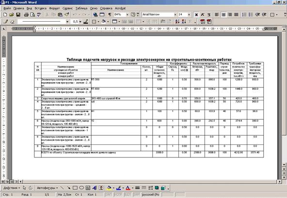 После заполнения всех граф проводится расчет (активизация кнопки «Расчет»), затем при активизации клавиши «Документ» открывается документ MS Word с итоговой таблицей. Если есть незаполненные поля или не проведен расчет при обращении к «Документ», программа выдает сообщения.