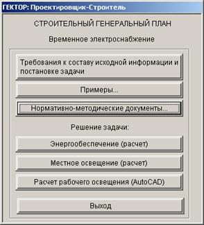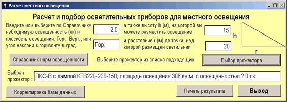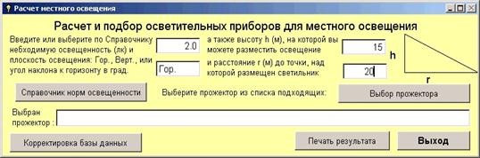 • Расчет и подбор источников света для освещения мест производства наружных строительных и монтажных работ выполнен на базе Visual FoxPRO.