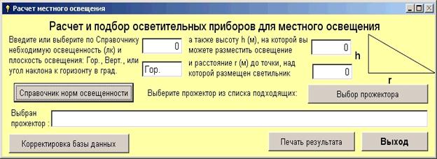 При входе в программу появляется основная форма для ввода исходных данных. Для ввода первых двух параметров можно использовать «Справочник норм освещенности»