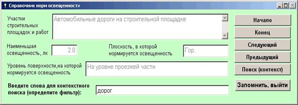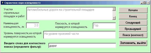 «Справочник норм освещенности» (ГОСТ 12.1.046-85) обеспечен обычными кнопками навигации, а также контекстным поиском по наименованию участков работ.