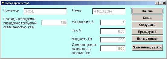 Список прожекторов, удовлетворяющих условиям проведенного расчета можно пролистать, его можно распечатать, а выбранный прожектор запомнить