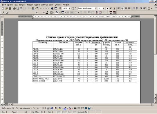 Название выбранного прожектора появляется в окне, а его полную характеристику можно получить в виде документа MS Word.