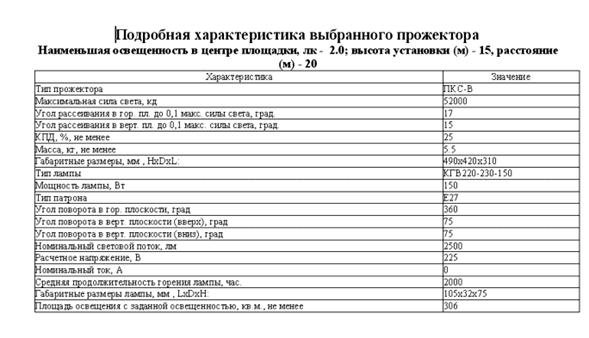 Пример подробной характеристики выбранного прожектора - документ MS Word.