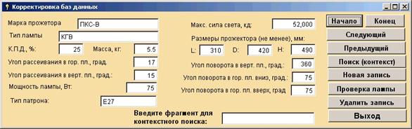 При корректировке базы данных по прожекторам для пролистывания используются обычный навигационные кнопки и контекстный поиск по марке прожектора (для пролистывания - повторное нажатие кнопки).