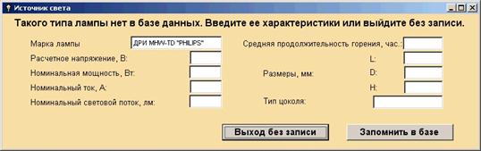 Чтобы проверить, есть ли применяемый для данного прожектора тип лампы в базе данных ламп, активируется кнопка «Проверка лампы». Если лампа отсутствует, появляется следующая форма.