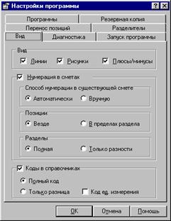 Окно позволяет установить такие настройки работы программы, как демонстрируемые сообщения, применяемые способы демонстрации справочников и смет, применяемые разделители и т.п.