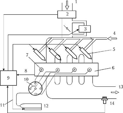 Рис.1.2: 1 - поступление воздуха; 2 -датчик расхода воздуха; 3 - исполнительный блок управления частотой вращения коленчатого вала на холостом ходу; 4 - топливо; 5 - форсунки впрыска топлива; 6 - двигатель; 7 - свечи зажигания; 8 - сигнал датчика частоты вращения коленчатого вала двигателя; 9 - электронный блок управления; 10 -распределитель зажигания; 11 - выходной сигнал; 12 - катушка зажигания; 13 - отработавшие газы; 14 - датчик кислорода.