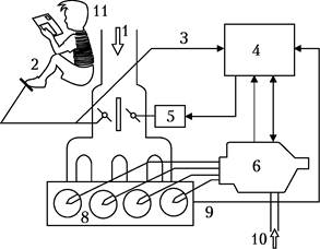 Рис.1.3: Структура системы управления топливным насосом высокого давления 1 - поступление воздуха; 2 - датчик открытия дроссельной заслонки; 3 - сигнал о степени открытия дроссельной заслонки; 4 - электронный блок управления; 5 - исполнительный блок; 6 - топливный насос высокого давления; 7 - форсунка впрыска топлива; 8 - двигатель; 9 - сигнал частоты вращения коленчатого вала двигателя; 10 - топливо; 11 - водитель во время чтения инструкции по использованию системы управления.