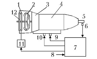 Рис.1.4: 1 - сцепление; 2 - диски сцепления; 3 - механизм ускоряющей передачи; 4 - механизм изменения передаточного числа; 5 - выходной вал; 6 - датчик скорости автомобиля; 7 -электронный блок управления; 8 - сигнал угла открытия дроссельной заслонки; 9 - электромагнитный клапан изменения передаточного числа; 10 - гид равлическая система; 11 - электромагнитный клапан сцепления; 12 - маховик двигателя.