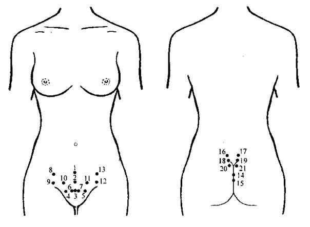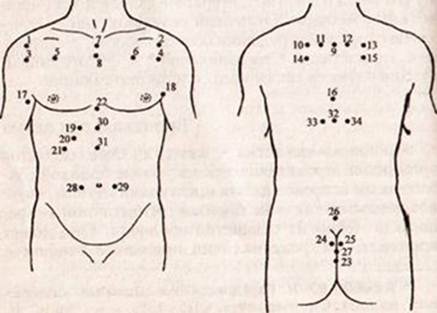 Места постановки пиявок: область сосцевидного отростка, область правого подреберья (печень), левая половина грудной клетки, вдоль поражённых вен в шахматном порядке, вокруг копчика, височная область.