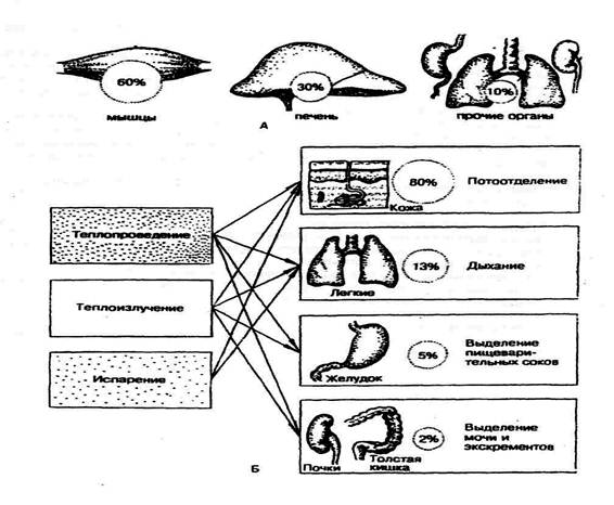 Пути теплообразования (а) и теплоотдачи (б). Теплопродукция - результат биохимических процессов,