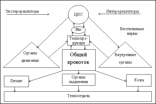 Рис. 2 Схема регулирования температуры тела (по К. Кулланде, 1976)