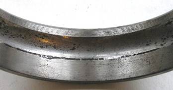 Трещины поперек беговых дорожек – результат воздействия динамических нагрузок, ударов или ошибок монтажа (рисунок 3.14а). Сколы бортов колец - результат динамических воздействий осевой силы (рисунок 3.14б).