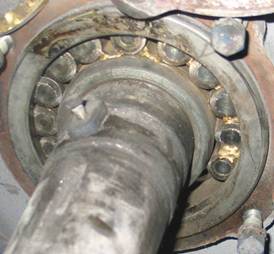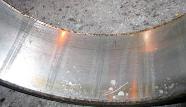 Увеличенная осевая игра пары радиально-упорных шариковых подшипников, приводит при возникновении осевой силы к появлению гранности или к осповидному выкрашиванию на нерабочей части беговой дорожки (рисунок 5.46).