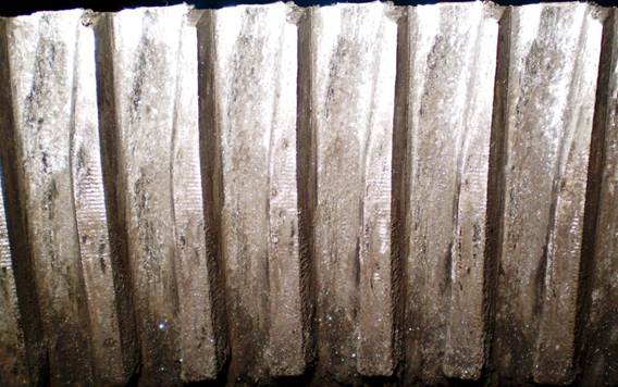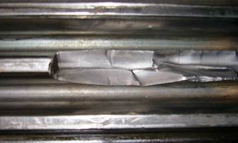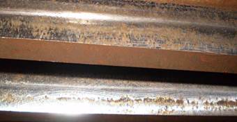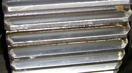Отсутствие смазки между контактирующими поверхностями приводит к повышению температуры, разрушению поверхностных твердых пленок окислов и возникновению адгезионных связей между контактирующими зубьями. Силы на площадках контактов должны быть достаточными для разрушения твердых пленок окислов. Для тяжелонагруженных высокоскоростных зубчатых передач наиболее характерное проявление – вырывы металла на вершинах зубьев (рисунок 5.63). Рекомендации по предотвращению – обеспечить постоянное смазывание контактирующих поверхностей, в том числе, путем правильного выбора смазочного материала. Данный вид повреждения нарушает характер зацепления зубьев, увеличивает скорость износа и создает концентраторы напряжений на поверхности зубьев способствующие развитию усталостных трещин, сколам зубьев.
