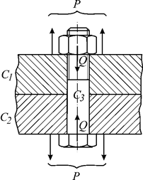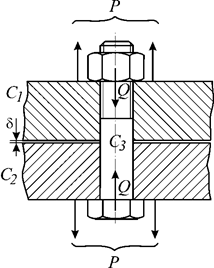Ослабление усилия затяжки Q< P под влиянием температурных воздействий и вибрационных сил приводит к раскрытию стыка и появлению зазора δ (рисунок 6.9). Суммарная жесткость узла изменяется практически мгновенно, из-за того, что элементы нагружаются последовательно (рисунок 6.9 б):