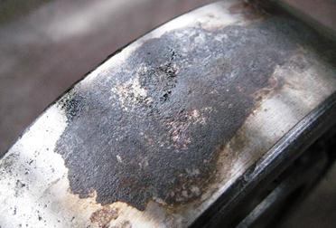 Перемещение сопрягаемых деталей, при малых зазоров, под воздействием переменных сил, при наличии окислителя приводит к появлению механо-химического процесса износа - фреттинг-коррозии. Это активизирует условия для развития повреждений сопрягаемых деталей, приводит к появлению стуков, ударов при работе подшипника. При дальнейшем развитии может служить причиной зарождения усталостных трещин. Визуально проявляется в виде интенсивного окисления поверхностей, появления продуктов коррозии на поверхности деталей в виде темных пятен на посадочных поверхностях колец подшипников (рисунок 6.11).