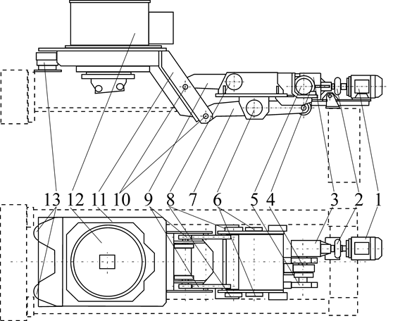 Широкое распространение в практике непрерывной разливки стали на сортовых МНЛЗ, получили сдвоенные шарнирные четырехзвенные рычажные механизмы качания кристаллизатора (рисунок 8). Крутящий момент от двигателя 1 через соединительную (чаще всего баллонную) муфту 2 передается на понижающий редуктор 3 коническо-цилиндрический или червячный. Электродвигатель и редуктор установлены на качающейся независимой общей платформе. Тихоходный вал редуктора, совершающий 100…400 об/мин, соединен через эксцентриковую муфту 4, установленную в подшипниковых опорах 5, с кривошипом, преобразующим вращательное движение вала редуктора в возвратно-поступательное. Кривошип соединен с коромыслами 7 и 9. В шарнирных опорах 6 закреплены коромысла 7, а в шарнирных опорах 8 – коромысла 9. Неподвижные шарнирные опоры 6 и 8 рычажного механизма расположены в едином основании механизма качания, установленном и закрепленном на несущих металлоконструкциях МНЛЗ.