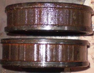 Износ деталей подшипников 5020 более значительный (рисунок 13), включая коррозию тел качения и беговых дорожек, абразивный износ глубиной до 1,0 мм. Характер абразивного износа напоминает бринеллирование и проявляется в виде углублений цилиндрической формы с шагом равным шагу тел качения. Подвод смазочного материала к одному из подшипников осуществляется сбоку снизу. Работа в зоне воздействия на узлы трения пара приводит к коррозии тел качения и беговой дорожки из-за недостаточной защиты пластичной смазки.