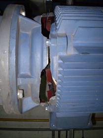 В процессе эксплуатации 5-ти бустерных насосов с частотой вращения 3600 об/мин проведено 2 предупредительные замены подшипников 6319 С3 ведомого вала насоса с приводной стороны за период - 10 месяцев. Диагностические признаки – локальное повышение шума и вибрации, зафиксированные органолептическими методами. В третий раз - зафиксирован внезапный отказ. Результат отказа – разрушение корпуса двигателя, корпуса насоса (рисунок 18).