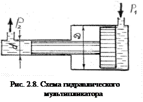 Для увеличения давления жидкости при нагнетании используют гидравлические мультипликаторы. Схема гидравлического мультипликатора приведена на рис. 2.8.