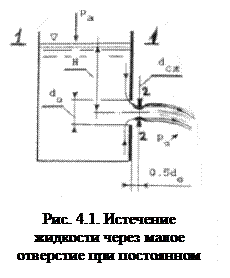 Рассмотрим случай истечения жидкости при постоянном напоре (рис. 4.1). Для получения расчетной зависимости запишем уравнение Бернулли для двух сечений 1 – 1 и 2 – 2 относительно плоскости сравнения О-О проведенной по дну судна. Примем к сведению, что жидкость вытекает в воздушное пространство с атмосферным давлением, а на поверхности жидкости также давление атмосферное, и имеет место только местное сопротивление. Тогда