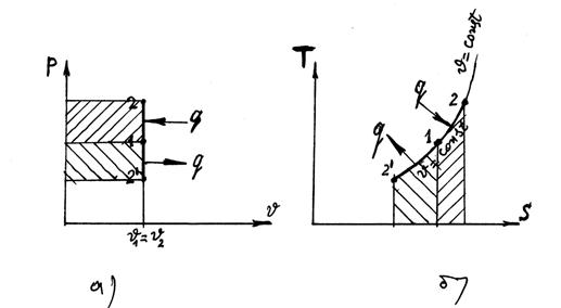 Рис. 7.1 а) рабочая диаграмма изохорного процесса; б) тепловая диаграмма изохорного процесса.