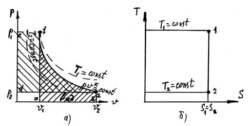 Рис. 7.4 а) рабочая диаграмма адиабатного процесса; б) тепловая диаграмма адиабатного процесса.