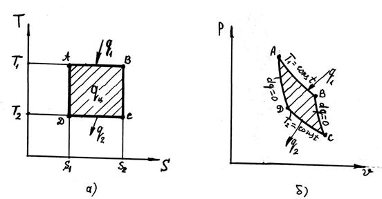 Рис. 7.6 Цикл Карно а) изображение цикла Карно в Ts-диаграмме;