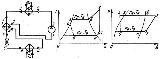 На рис. 10.1 показана схема и цикл в T-S и p-h диаграммах простейшей холодильной установки, с регенеративным теплообменником.
