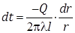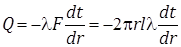 Выделим внутри стенки трубы кольцевой слой радиусом r и толщиной dr, ограниченный двумя изотермическими поверхностями. Количество тепла, согласно закону Фурье проходящее в единицу времени через этот слой, можно определить как