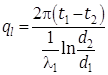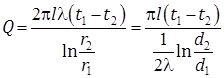 Количество тепла, передаваемое через цилиндрическую стенку пропорционально длине трубы, коэффициенту теплопроводности и разности температур и обратно пропорционально натуральному логарифму отношения внешнего диаметра трубы d2 к внутреннему d1.