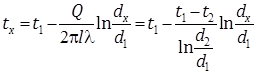 При постоянном значении коэффициента теплопроводности (l = const) температура внутри стенки изменяется по логарифмическому закону.