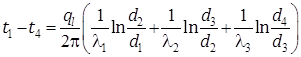Рассмотрим трехслойную цилиндрическую стенку. Примем, что слои выполнены из разных, но однородных материалов и посажены один на другой с натягом, то есть контакт между соприкасающимися поверхностями можно считать практически идеальным. Принимаем также, что теплопроводность каждого слоя постоянна и коэффициенты теплопроводности слоев l1, l2 и l3 соответственно. Обозначим диаметры и теплопроводность каждого слоя (рис. 12.5). Известны также температуры внутренней поверхности первого слоя t1 и внешней поверхности третьего слоя t4, которые при установившемся (стационарном) тепловом режиме будут иметь неизменные значения. Обозначим температуры в местах контакта слоев t2 и t3.